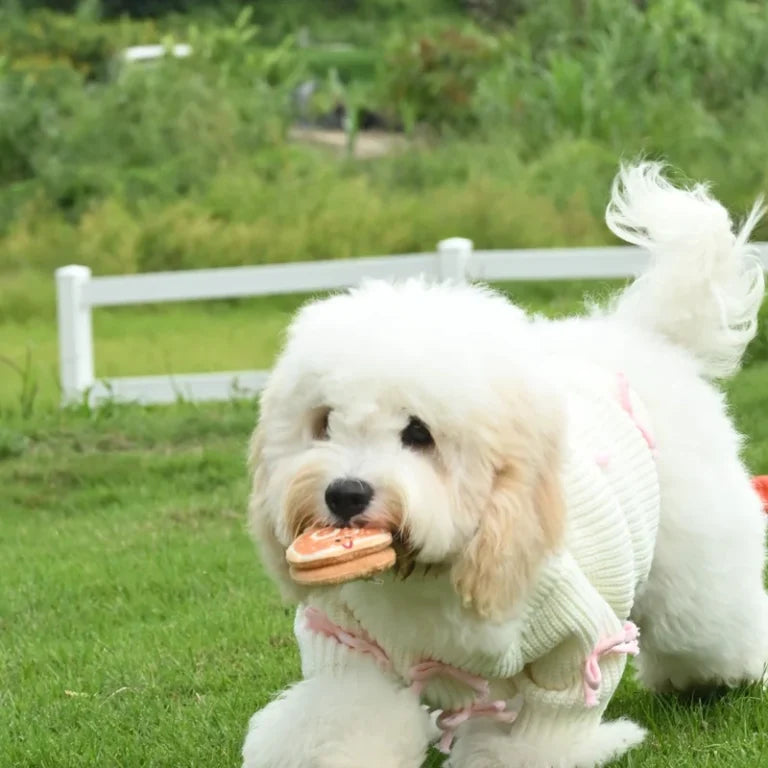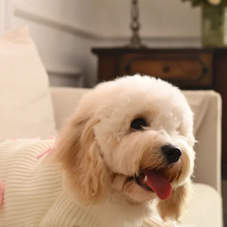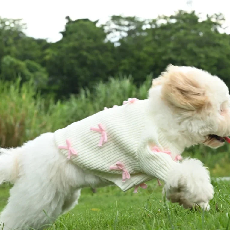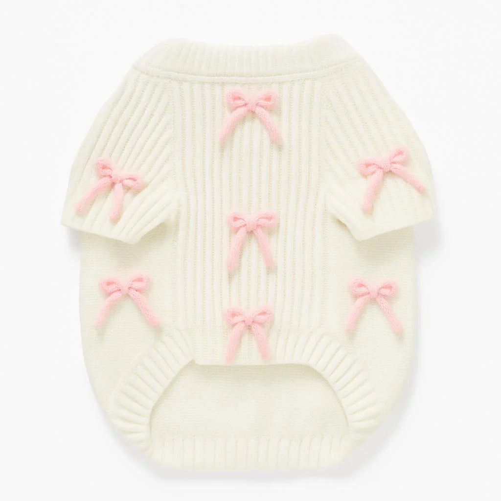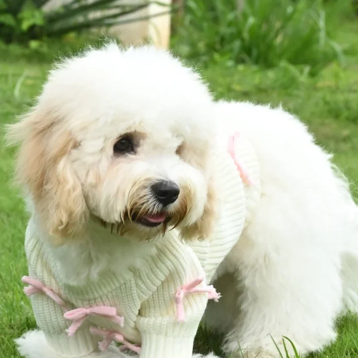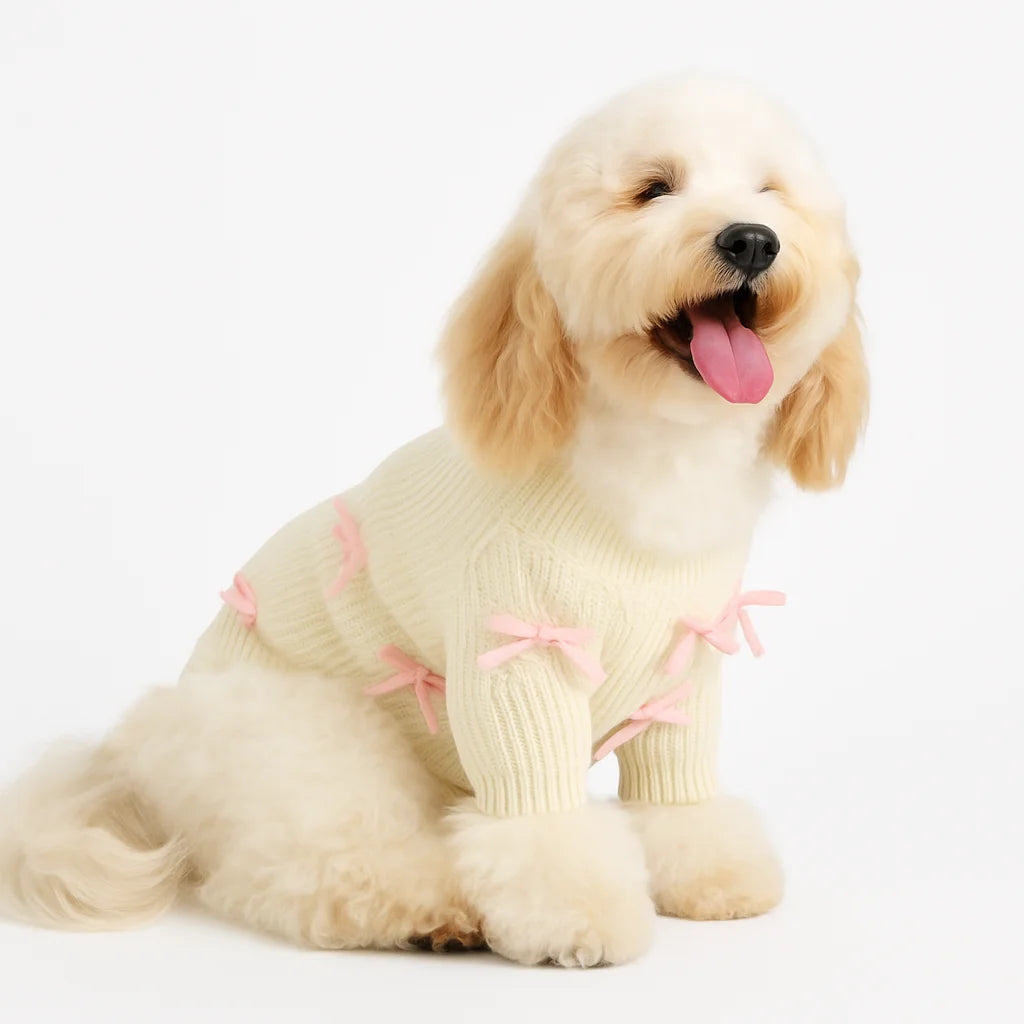Crèmekleurige gebreide hondentrui met roze strikaccenten
